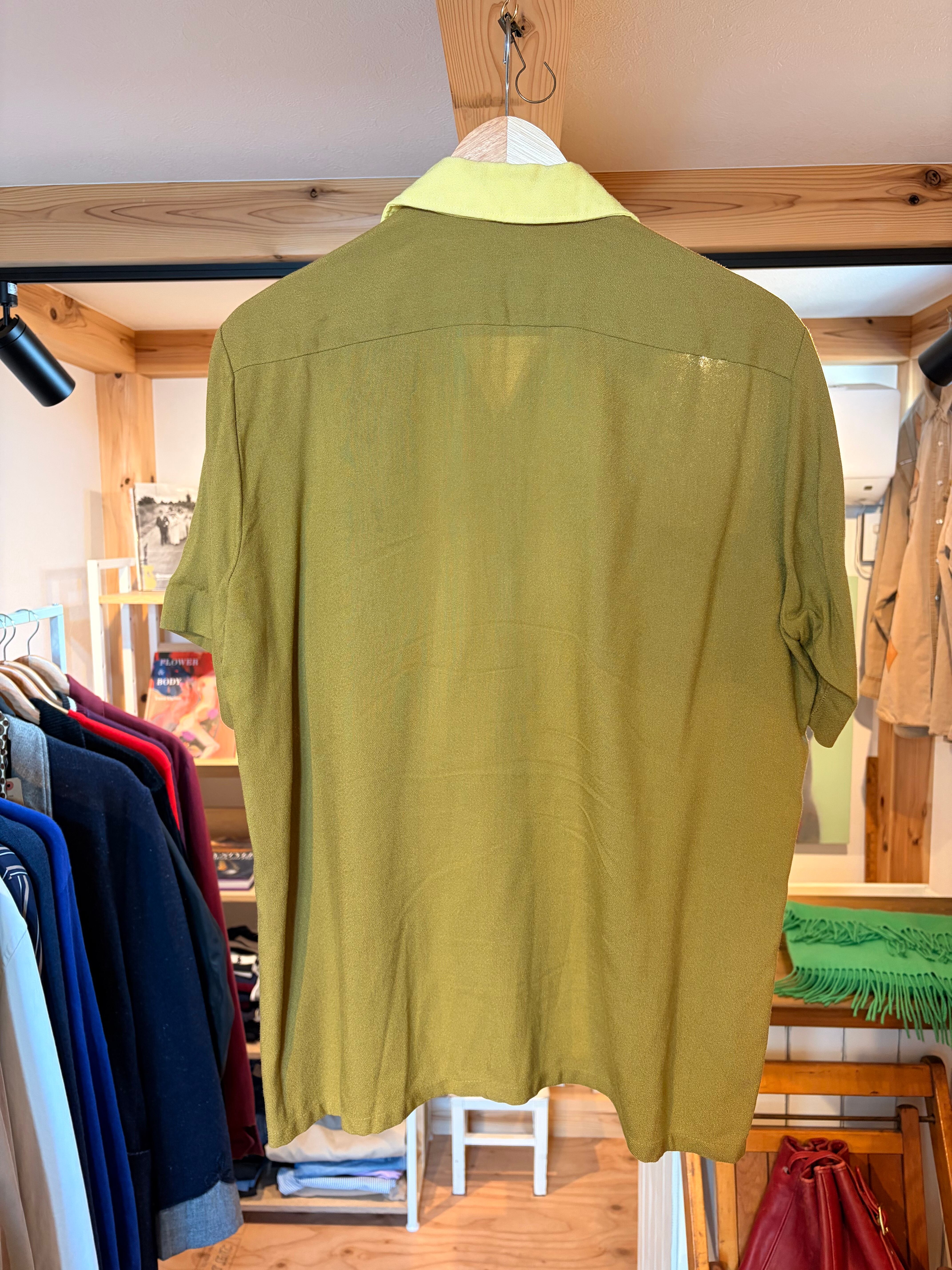 60年代のアメリカンカルチャーを感じれる半袖シャツ。レーヨン素材でイエローとカーキの絶妙な切り替えとオープンカラーのデザイン。
